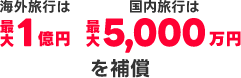 海外旅行保険最大1億円。国内旅行保険最大5,000万円補償。