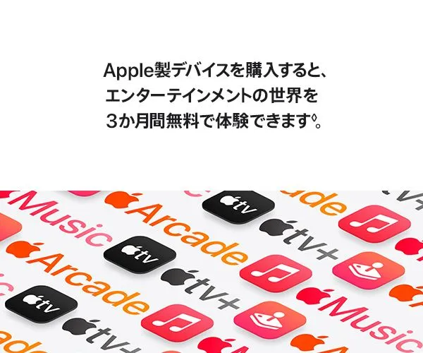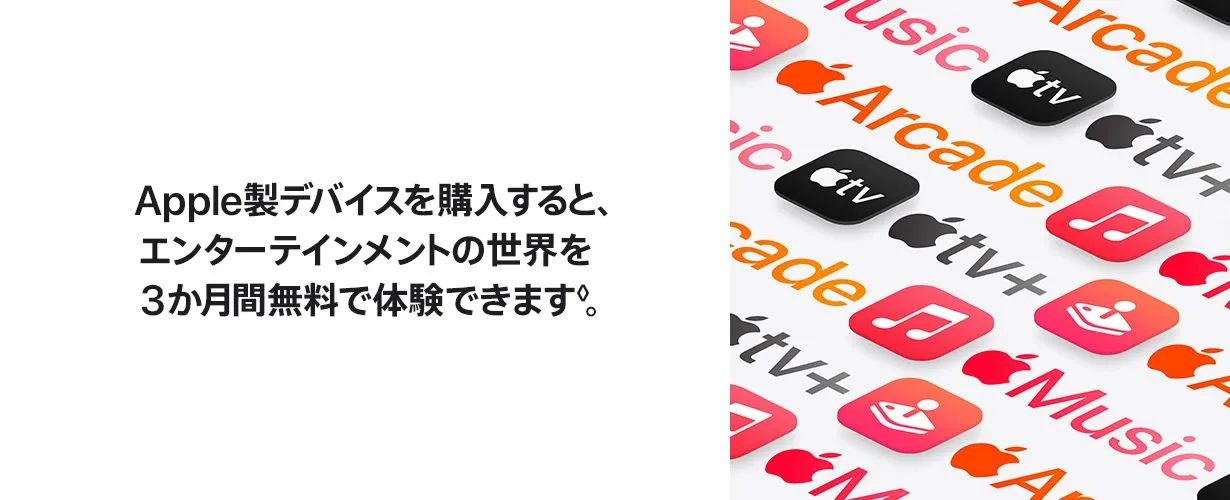 • Apple TV+体験オファー:新規登録の方と条件を満たす再登録の方のみが対象です。 体験利用の終了後は月額900円がかかります。 本オファーの利用は、1つのApple Accountにつき1回に限られます。ファミリー共有のグループに参加している場合は、個人または家族によるデバイスの購入数に関わらず、1家族につき1回に限られます。 あなた、またはその家族が3か月間もしくは1年間のApple TV+体験オファーをこれまでに利用している場合、本オファーは利用できません。 本オファーを利用するには、対象となるデバイスのアクティベーションから3か月以内にサブスクリプションに登録する必要があります。 キャンセルしない限りサブスクリプションは自動的に更新されます。 制限およびその他の条件が適用されます。 サブスクリプションは、ファミリー共有のグループにつき1件です。