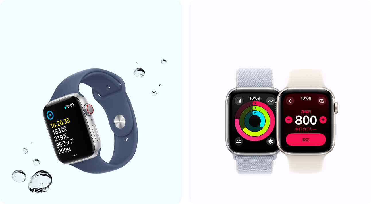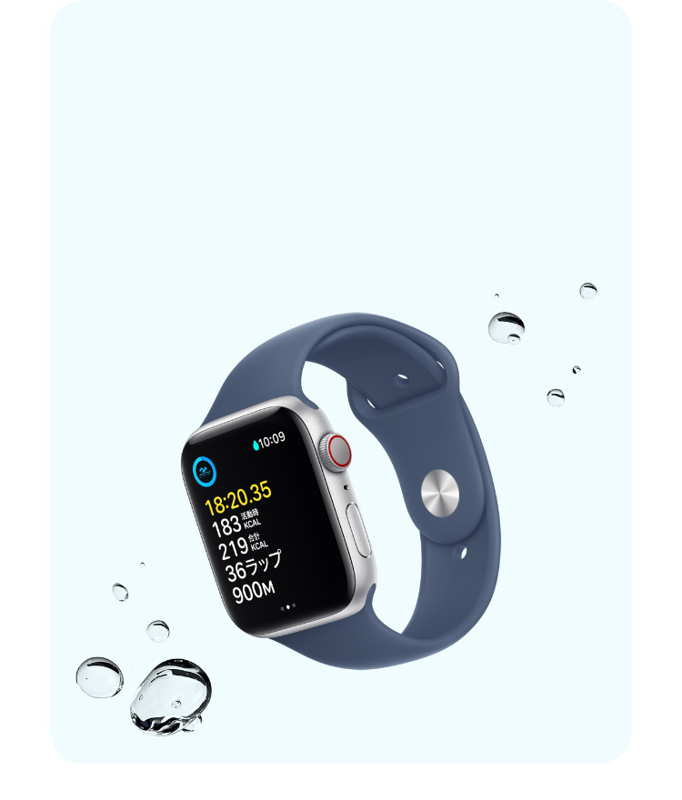 - 耐水性能と防塵性能:Apple Watch SEとApple Watch Series 10にはISO規格22810:2010にもとづく50メートルの耐水性能があり、プールや海で泳ぐなど、浅水でのアクティビティで使用できます。Apple Watch Series 10は水深6メートルまでのシュノーケリングでも使用できます。スキューバダイビング、ウォータースキー、高速水流または低水深を超える潜水を伴うその他のアクティビティには使用しないでください。Apple Watch Ultra 2にはISO規格22810:2010にもとづく100メートルの耐水性能があり、高速ウォータースポーツと水深40メートルまでのレクリエーショナルスキューバダイビング(App Storeからダウンロードした対応する他社製アプリを利用)で使用できます。 水深40メートル以上のダイビングには使用しないでください。 耐水性能は永続的に維持されるものではなく、時間の経過とともに低下する可能性があります。 詳しくはsupport.apple.com/ja-jp/HT205000をご覧ください。 Apple Watch Series 10とApple Watch Ultra 2にはIP6X等級の防塵性能もあります。