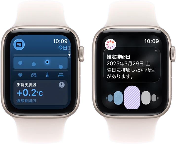 - 皮膚温センサー:皮膚温センサー機能は医療での使用を目的とするものではありません。皮膚温センサーは、Apple Watch Series 8 以降とすべての Apple Watch Ultra モデルでのみ利用できます。