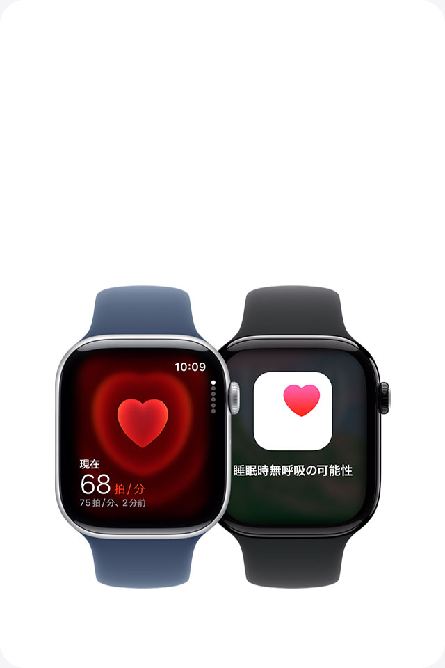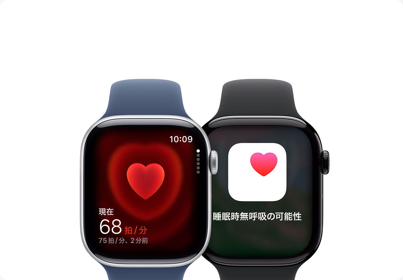 • 睡眠時無呼吸の通知:睡眠時無呼吸の通知機能は Apple Watch Series 9 以降および Apple Watch Ultra 2 で利用できます。 この機能は、睡眠時無呼吸と診断されたことがない18歳以上の方による使用を目的とし、中等度から重度の睡眠時無呼吸を示唆する兆候を検出します。 販売名:Appleの睡眠時無呼吸の兆候の通知プログラム。 管理医療機器販売業者等:Apple Japan合同会社(東京都港区六本木6丁目10番1号六本木ヒルズ 0120-277-535)