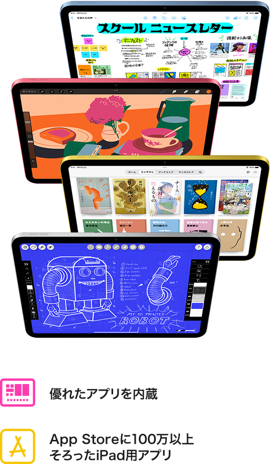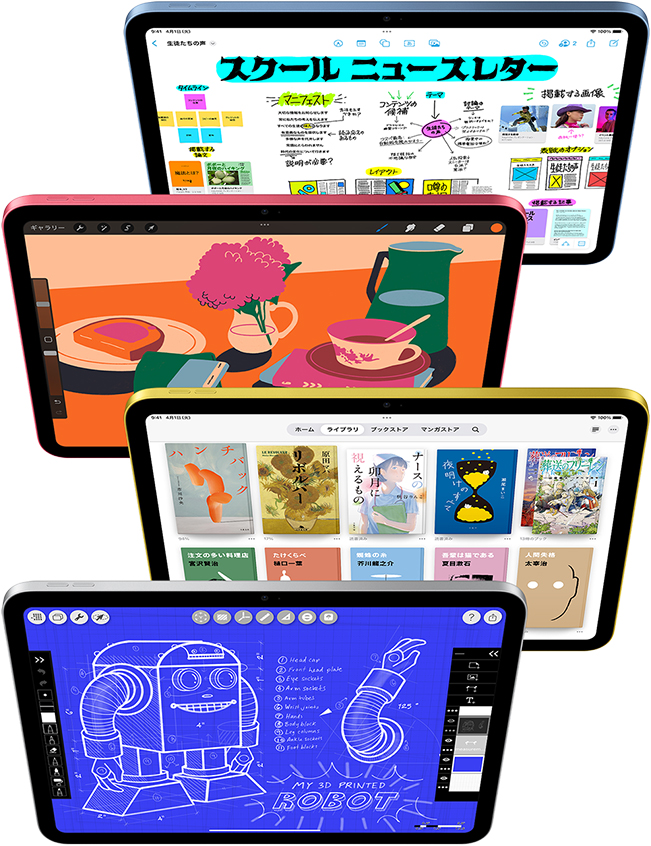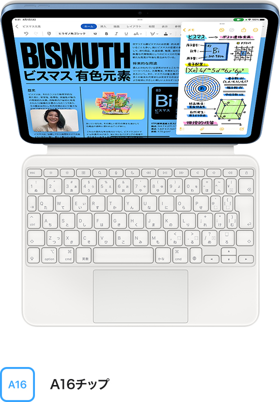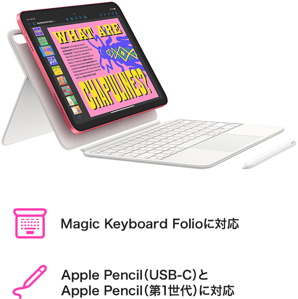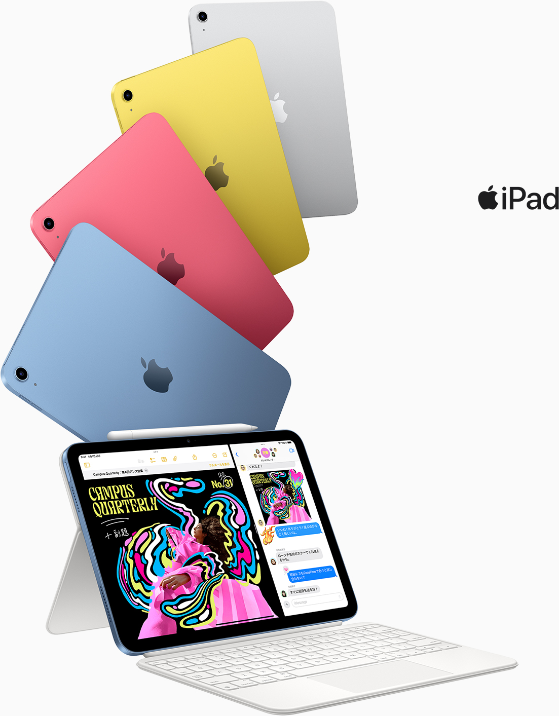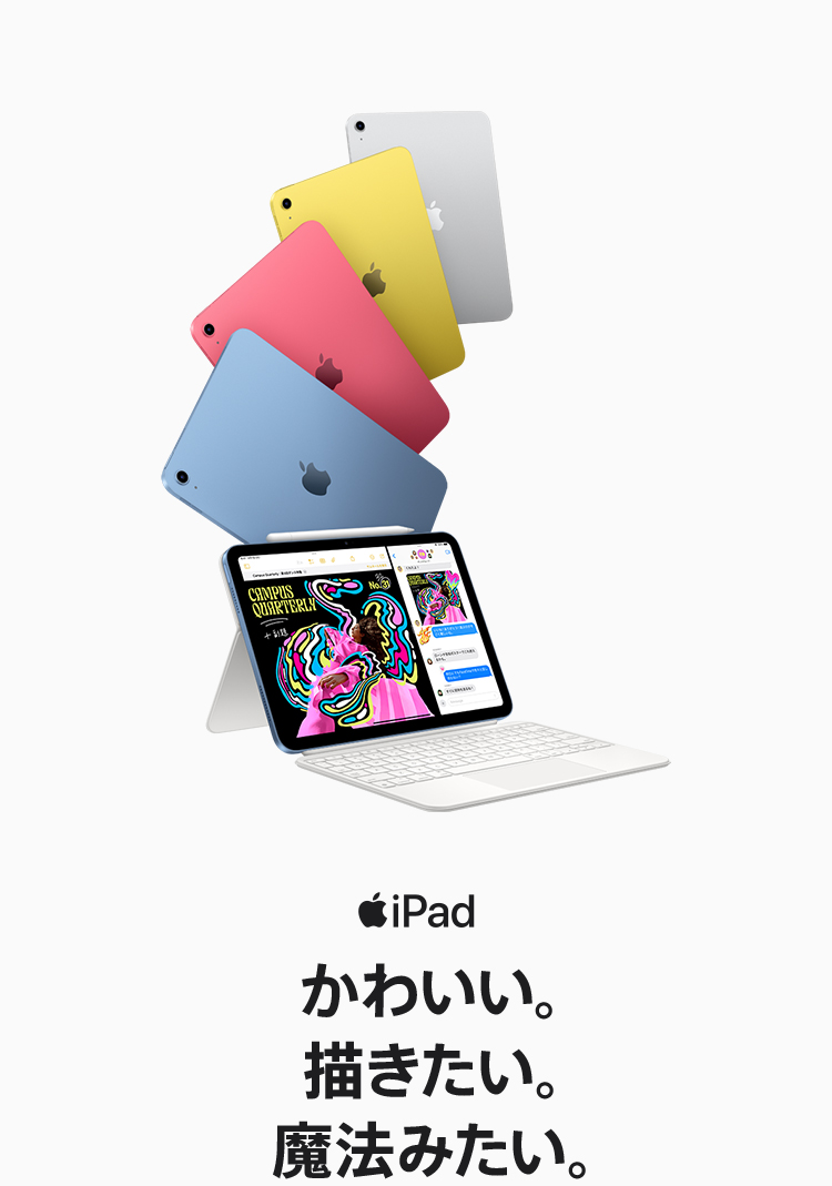 • アクセサリ:アクセサリは別売りです。 在庫が限られている場合があります。 互換性は世代によって異なります。 Apple Pencil(第1世代)を iPad(A16)または iPad(第10世代)で使用するにはUSB-C - Apple Pencilアダプタが必要です。