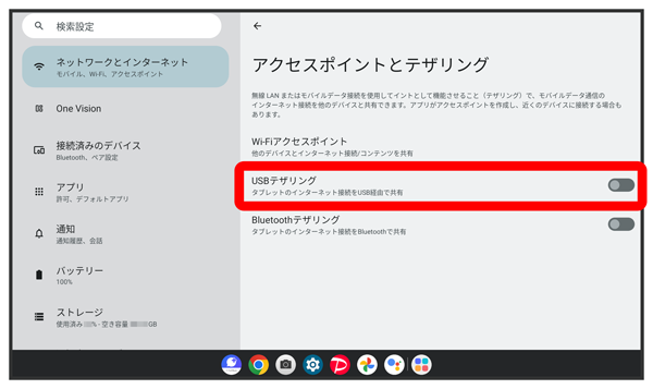 - USB接続でのテザリングを終了する場合は、タブレットの「USBテザリング」を無効にしてください。