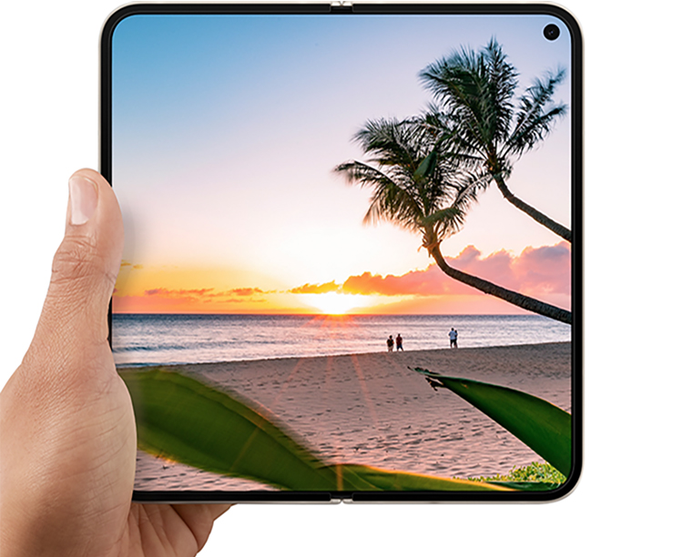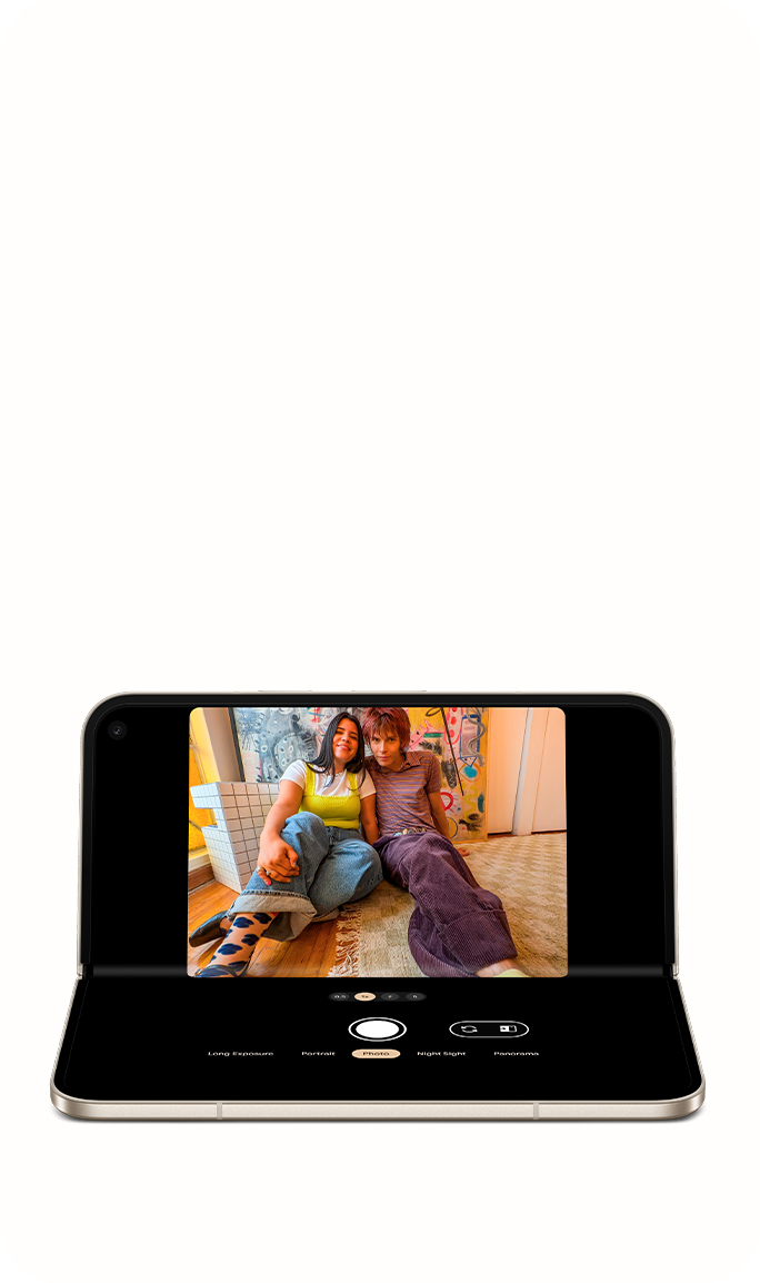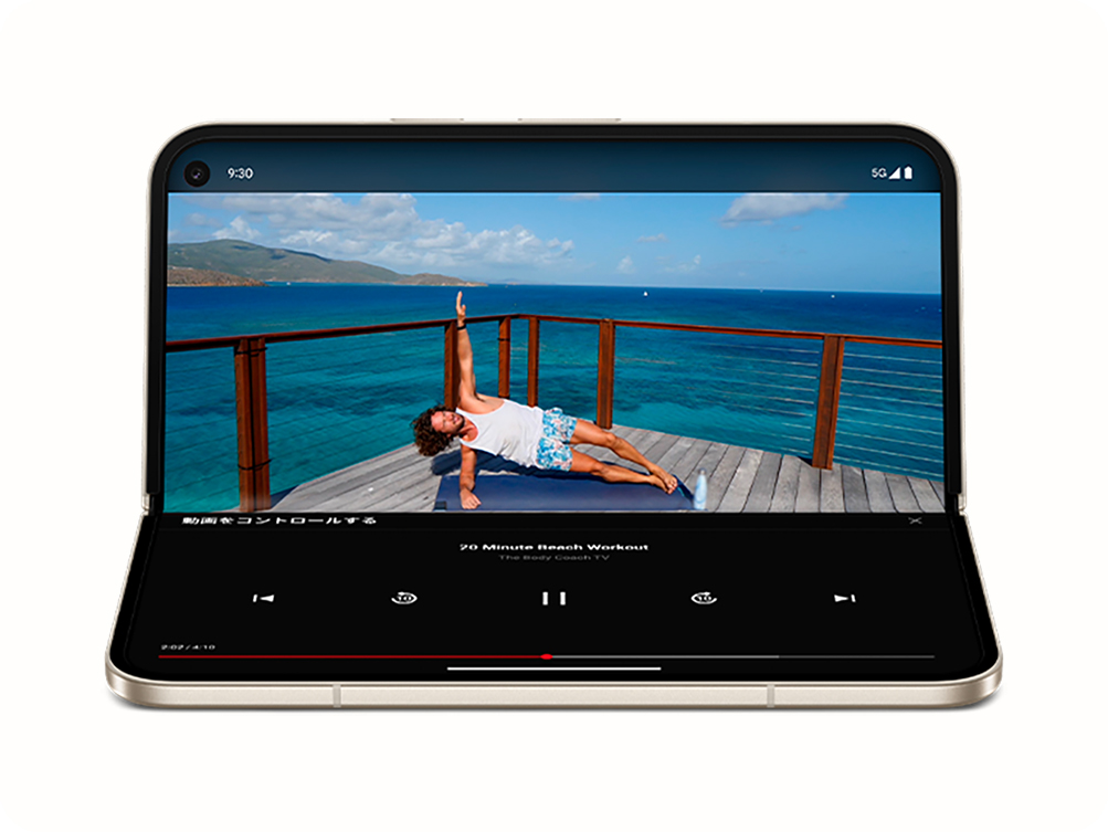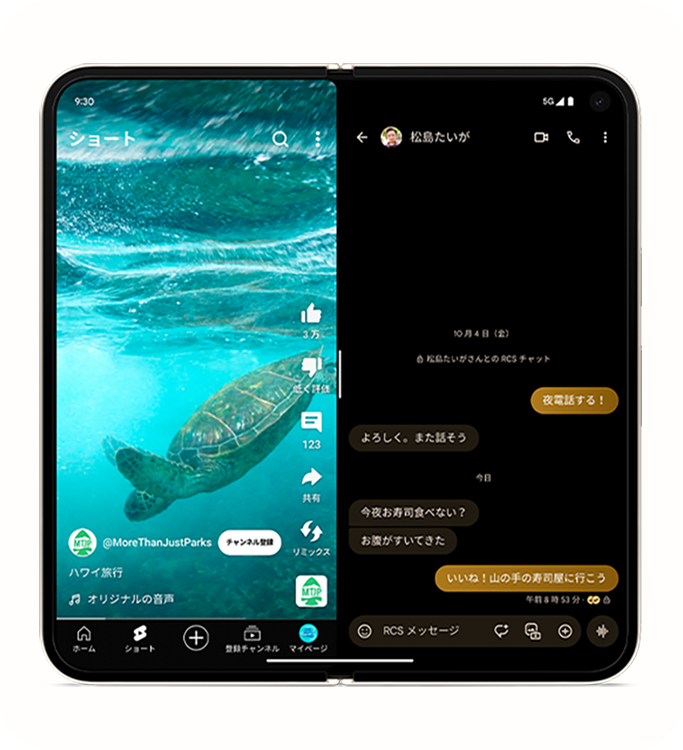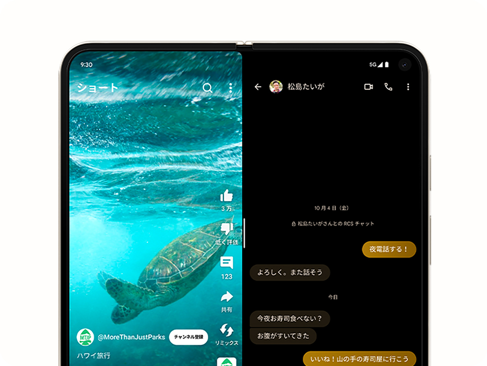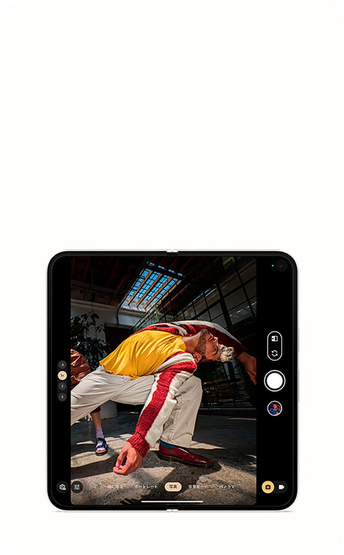 1 ディスプレイは角に丸みがあります。長方形として対角線を測定したときの外側ディスプレイのサイズは 6.3 インチ、内側ディスプレイのサイズは 8 インチです。実際の表示可能領域はそれより小さくなります。サイズは構成および製造工程によって異なる場合があります。 2 日本市場における他の折りたたみ式スマートフォンとの比較。インナー ディスプレイのサイズに基づきます。 3 対応アプリが必要です。