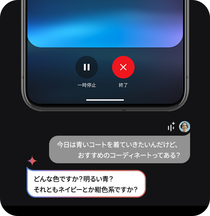 1 Gemini モバイルアプリは一部のデバイス、言語、国や地域でご利用いただけます。インターネット接続が必要です。回答の正確性をお確かめください。 2 インターネット接続、対応デバイス、対応アプリ、および対応した画面が必要です。結果は画像の一致状況によって異なります。◯ Gemini Live 対応機種:Google Pixel 6 以降の Google Pixel。◯ 回答結果は実際と異なる場合があります。◯ 個人の Google アカウントで Gemini Live を使用するには 18 歳(またはお住まいの国の該当する年齢)以上である必要があります。◯ 記載内容は 2024 年 10 月 30 日現在の情報です。予告なく変更する場合があります。