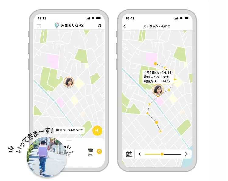 みまもりGPSは、定期的に現在地を測位しており、アプリを開くと直近の位置情報が表示されます。アプリから手動で更新もでき、一番知りたい"今どこにいるのか"がわかります。