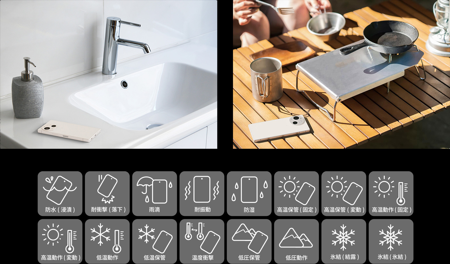 ※8 米国国防総省の調達基準(MIL-STD-810H)の15項目、防水(浸漬)、防水(雨滴)、耐振動、防湿、高温保管(固定)、高温保管(変動)、高温動作(固定)、高温動作(変動)、低温動作、低温保管、温度耐久(温度衝撃)、低圧保管、低圧動作、氷結(結露)、氷結(氷結)に準拠した試験を実施。および米国国防総省の調達基準(MIL-STD-810G)の1項目、耐衝撃(落下)に準拠した試験を実施。なお、すべての衝撃に対して、無破損、無故障を保証するものではありません。 ※9 IPX5/8の防水に対応。IPX5とは、内径6.3mmの注水ノズルを使用し、約3mの距離から1分あたり12.5リットルの水を最低3分間注水する条件であらゆる方向から噴流を当てても、通信機器としての機能を有することを意味します。IPX8とは、常温で水道水、かつ静水の水深1.5mのところに携帯電話を沈め、約30分間放置したあとに取り出したときに通信機器としての機能を有することを意味します。IP6Xの防塵に対応。IP6Xとは、保護度合いを指し、直径75µm以下の塵埃(じんあい)が入った装置に商品を8時間入れてかくはんさせ、取り出した時に、内部に塵埃(じんあい)が侵入しない機能を有することを意味します。ご使用の際はスロットキャップが確実に閉じているかご確認ください。防水/防塵性能を維持するため、異常の有無にかかわらず2年に1回部品の交換をおすすめします(有料)。