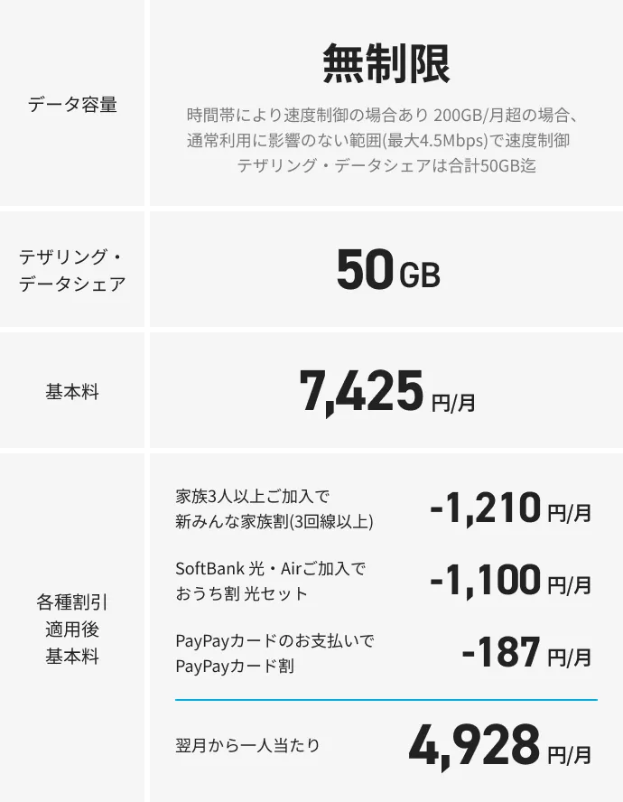 - 時間帯により速度制御あり。200GB/月超の場合、通常利用に影響のない範囲(最大4.5Mbps)で速度制御。テザリング・データシェアは合計50GBまで。
