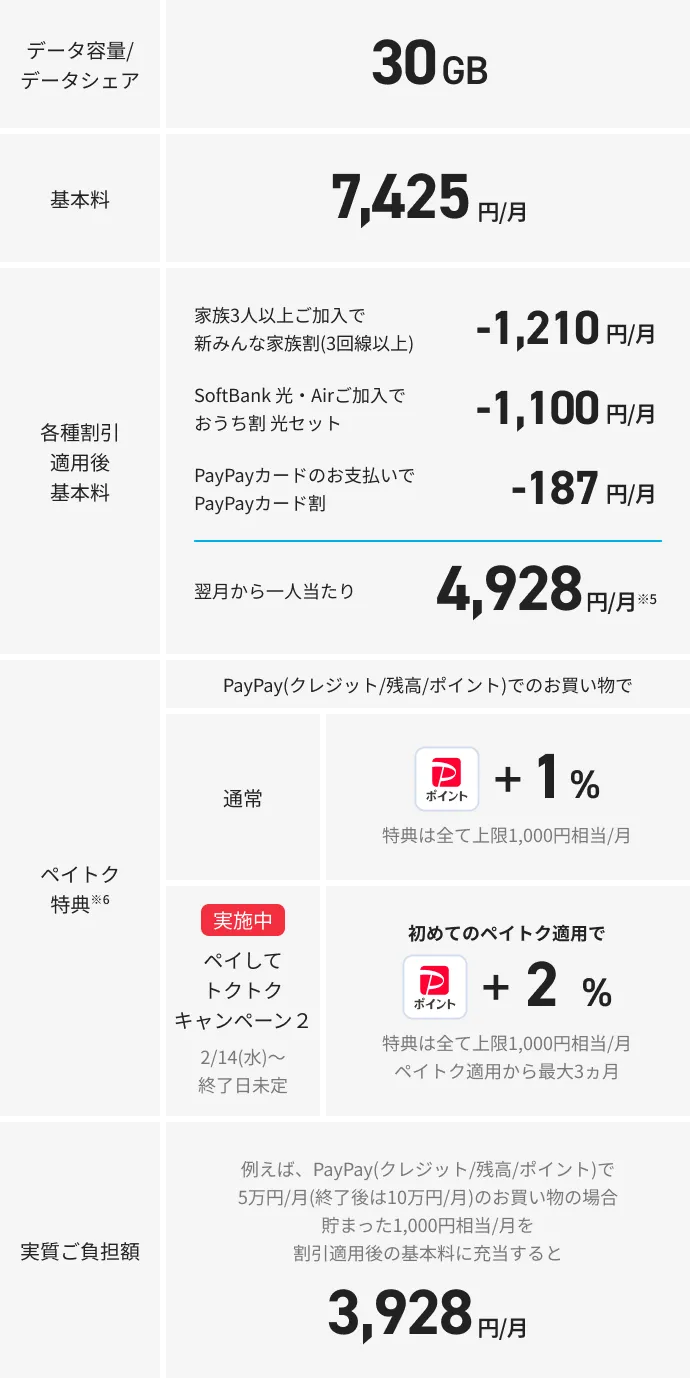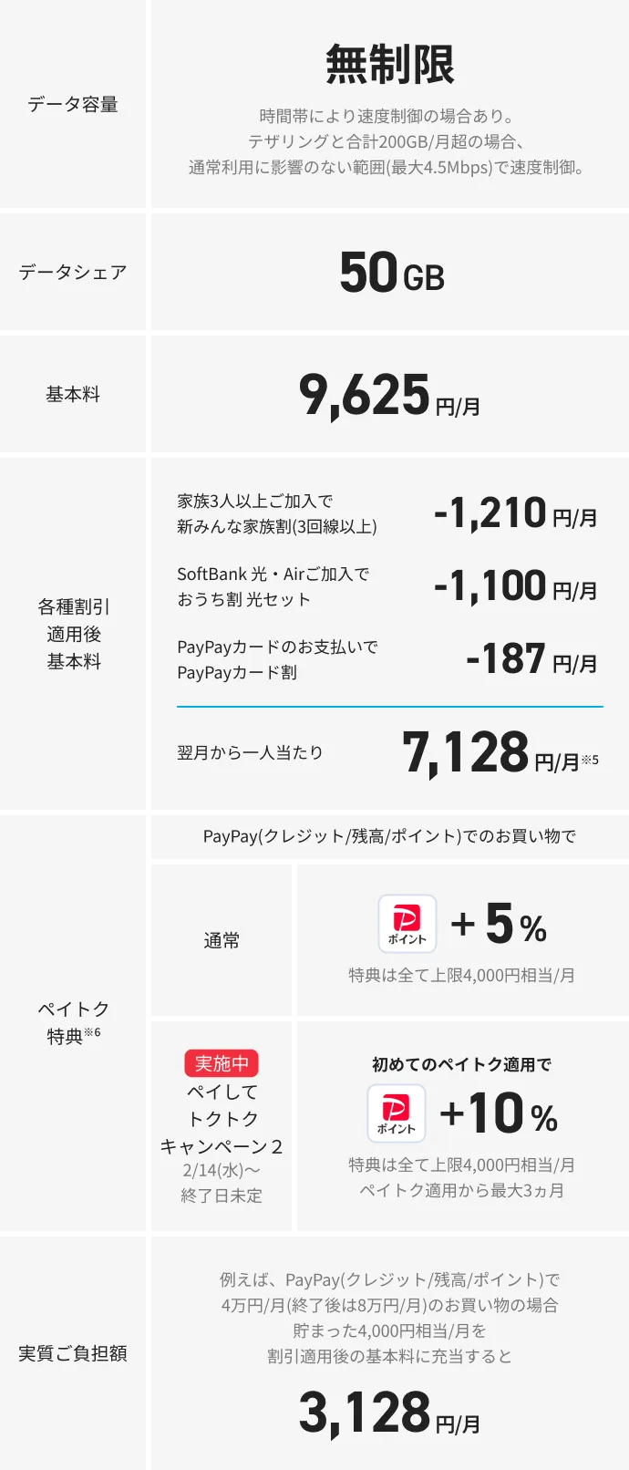 - 時間帯により速度制御の場合あり。ペイトク無制限プランはテザリングと合計200GB/月超の場合、通常利用に影響のない範囲(最大4.5Mbps)に速度制御。データシェアは50GBまで。