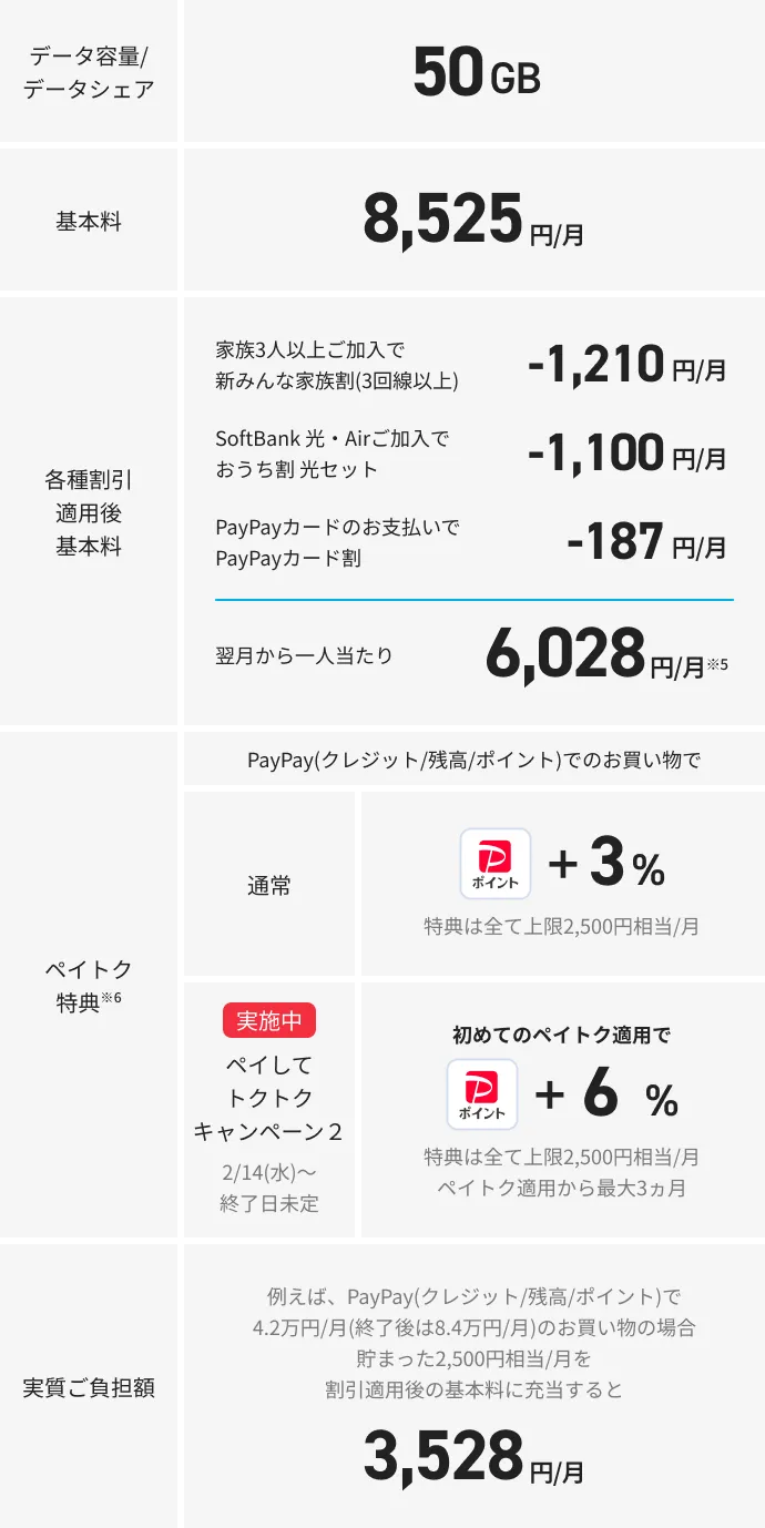 - 「ペイトク無制限/50」から別のプラン、「ペイトク30/メリハリ無制限+/メリハリ無制限/メリハリプラン/ウルトラギガモンスター+」から対象外プランに変更した場合等は割引を終了します。